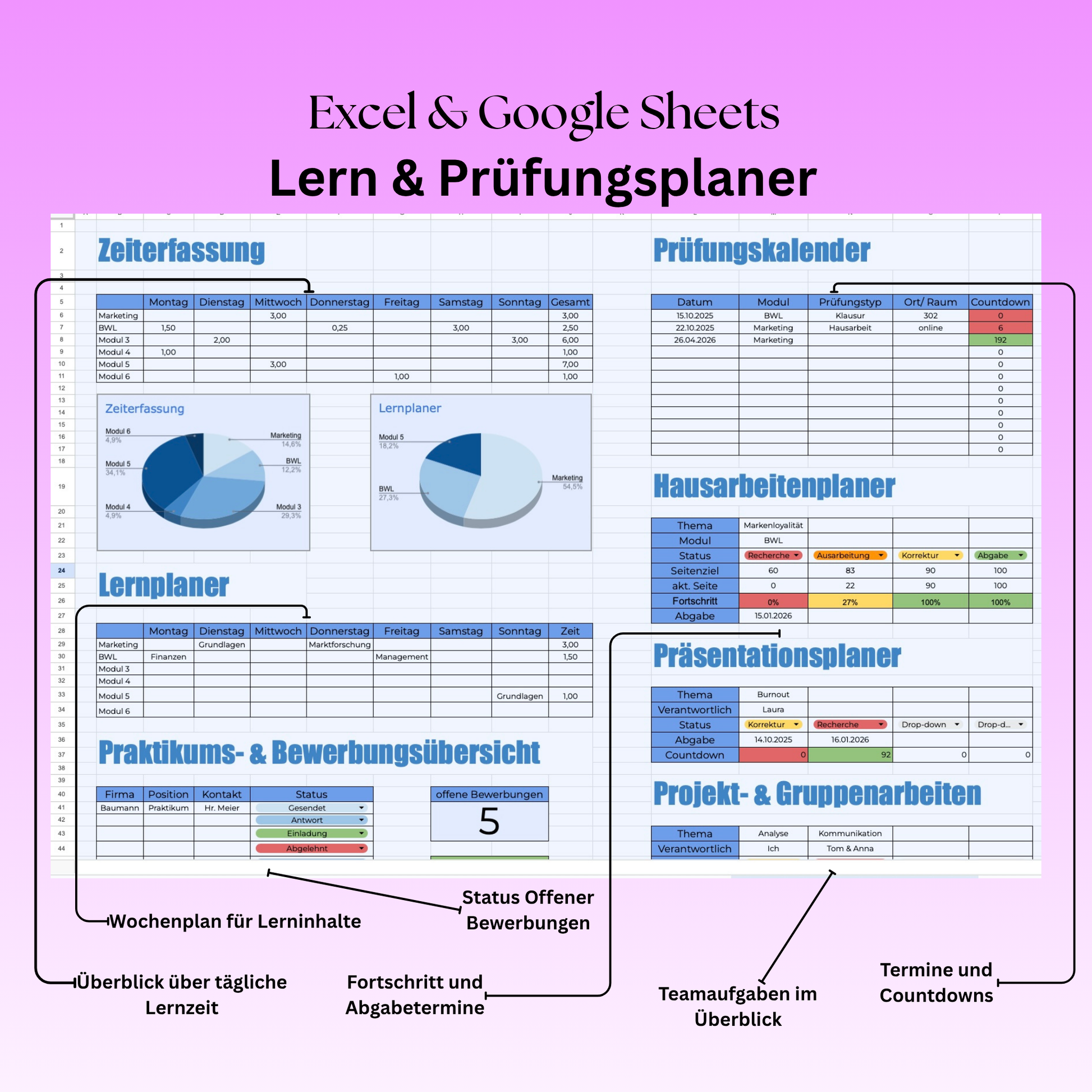 Der Studenten-Sheet-Planer verknüpft Semesterübersicht, Lernplan, Finanzen, Noten und Literatur.